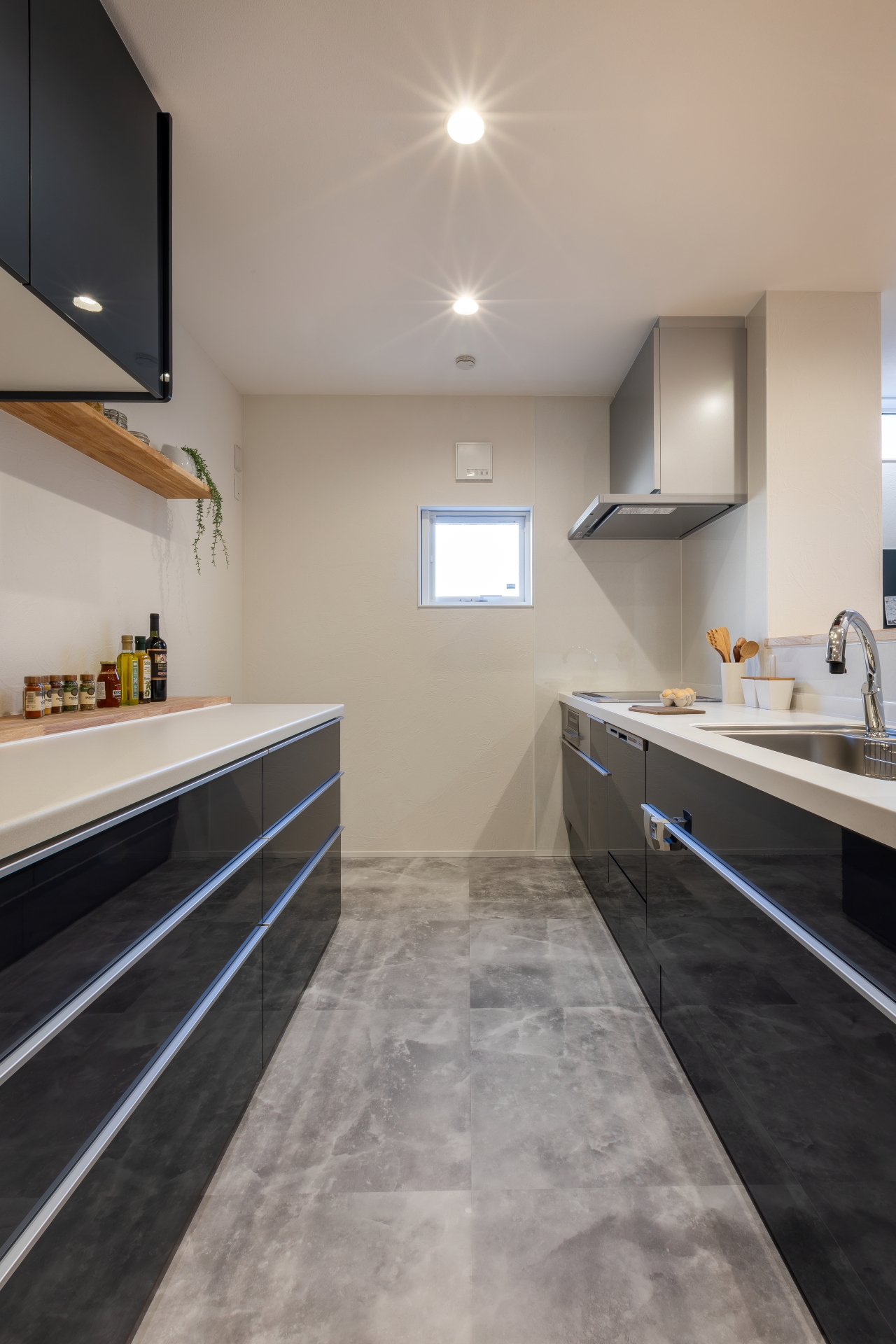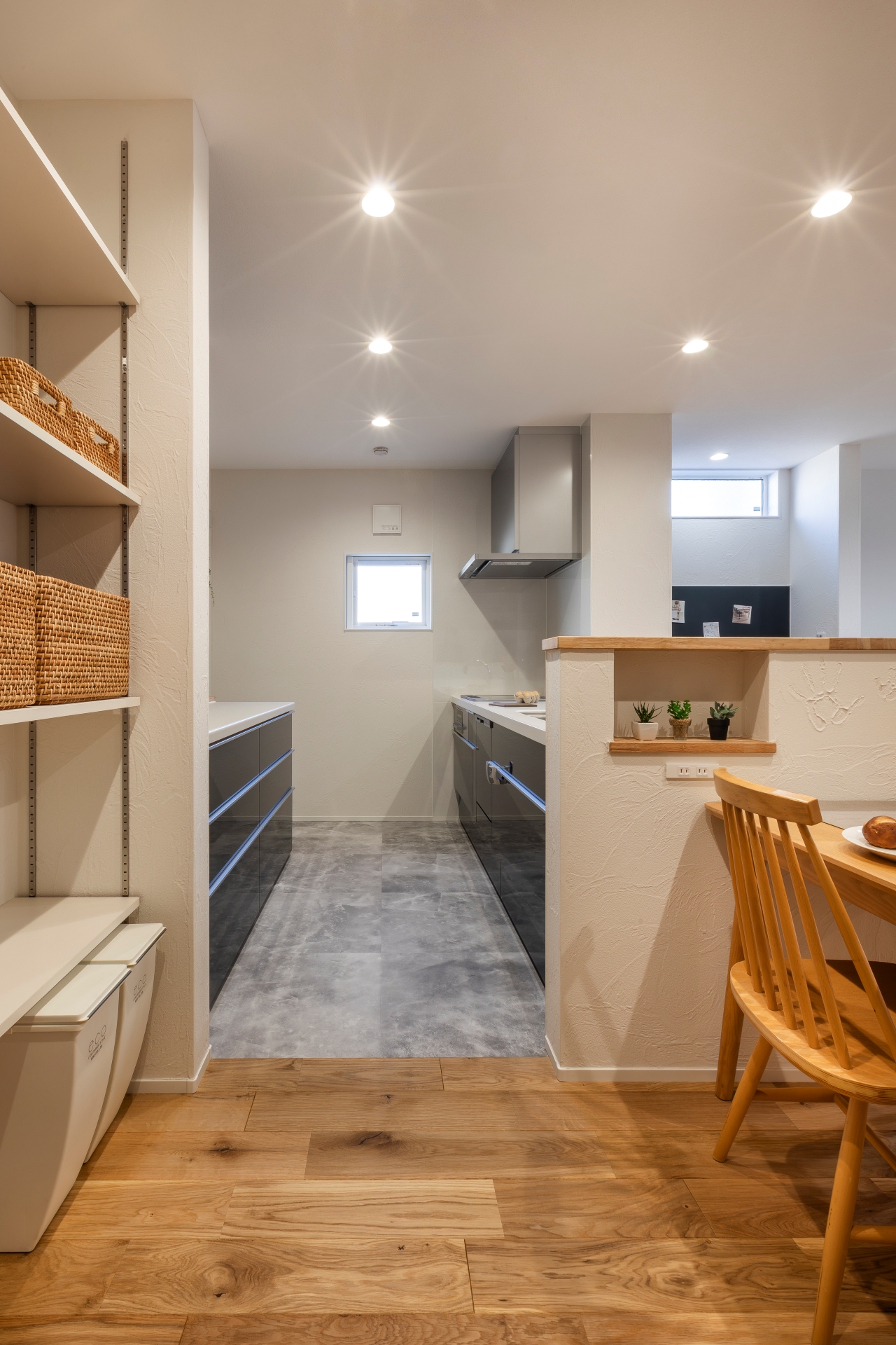 通路幅もゆったりと確保されているため、家族で並んで調理をしてもぶつかることがありません。対面式のカウンターからはリビング全体が見渡せ、会話を楽しみながら「家事の時間」を「家族の時間」に変えることができます。