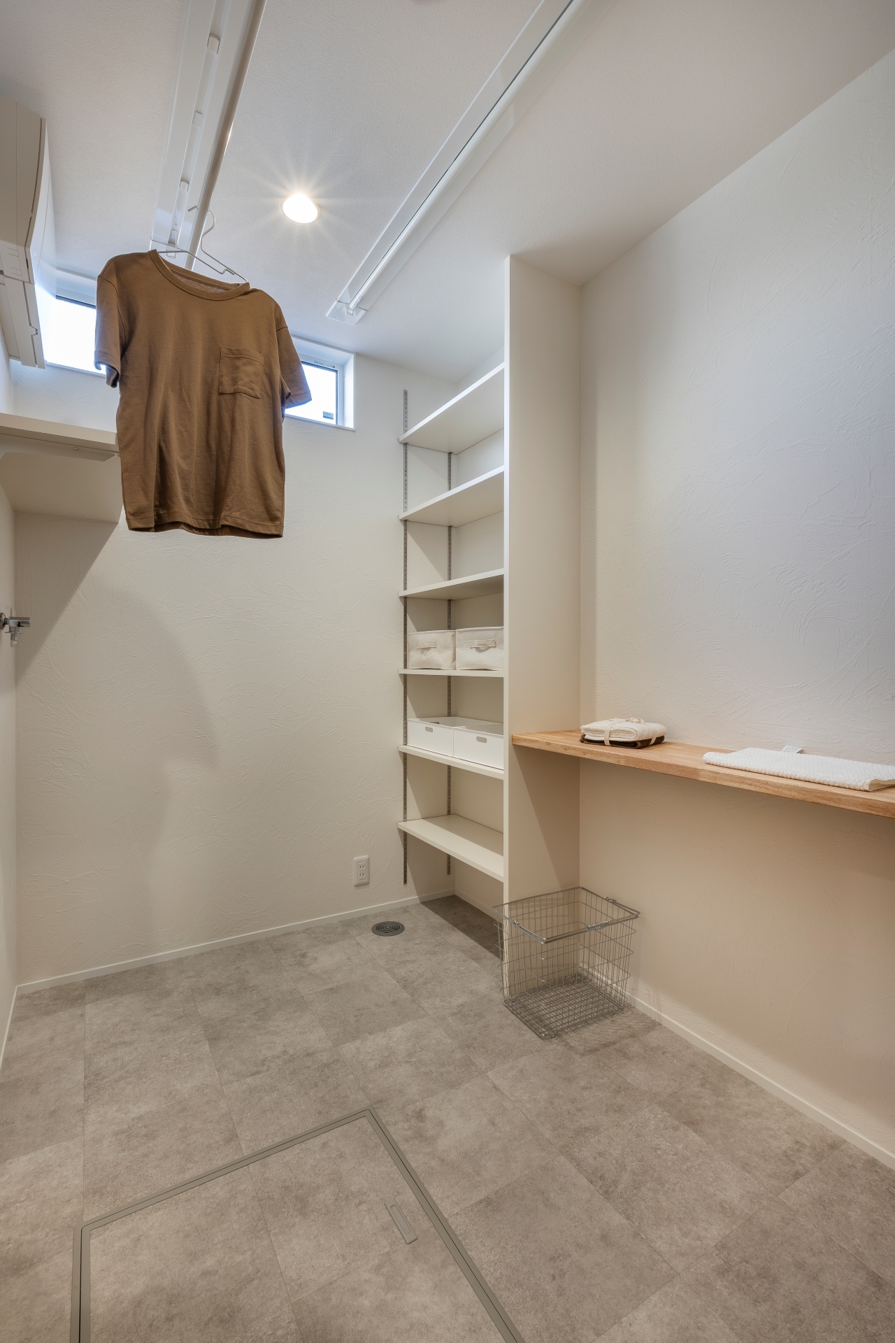 ランドリールームからファミリークローゼットへと繋がる動線で重い洗濯物を持って移動する手間を省き、「その場で干して、すぐ横にしまう」という、多忙なご教員の時間を生み出す究極の家事ラク動線を実現しました。