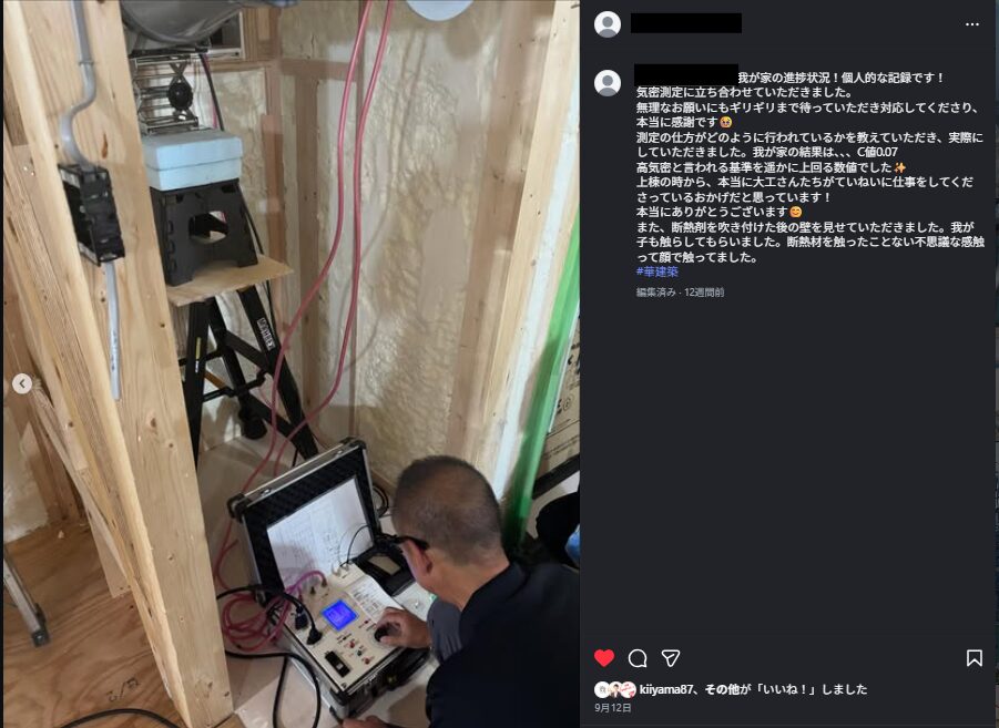 お施主様がInstagramの投稿で公開されていた「お家が形になっていくまでの過程」と 「C値0.07という高性能がもたらす空気の質」を体感していただければ性能の高さがはっきりとお分かりになるはずです!