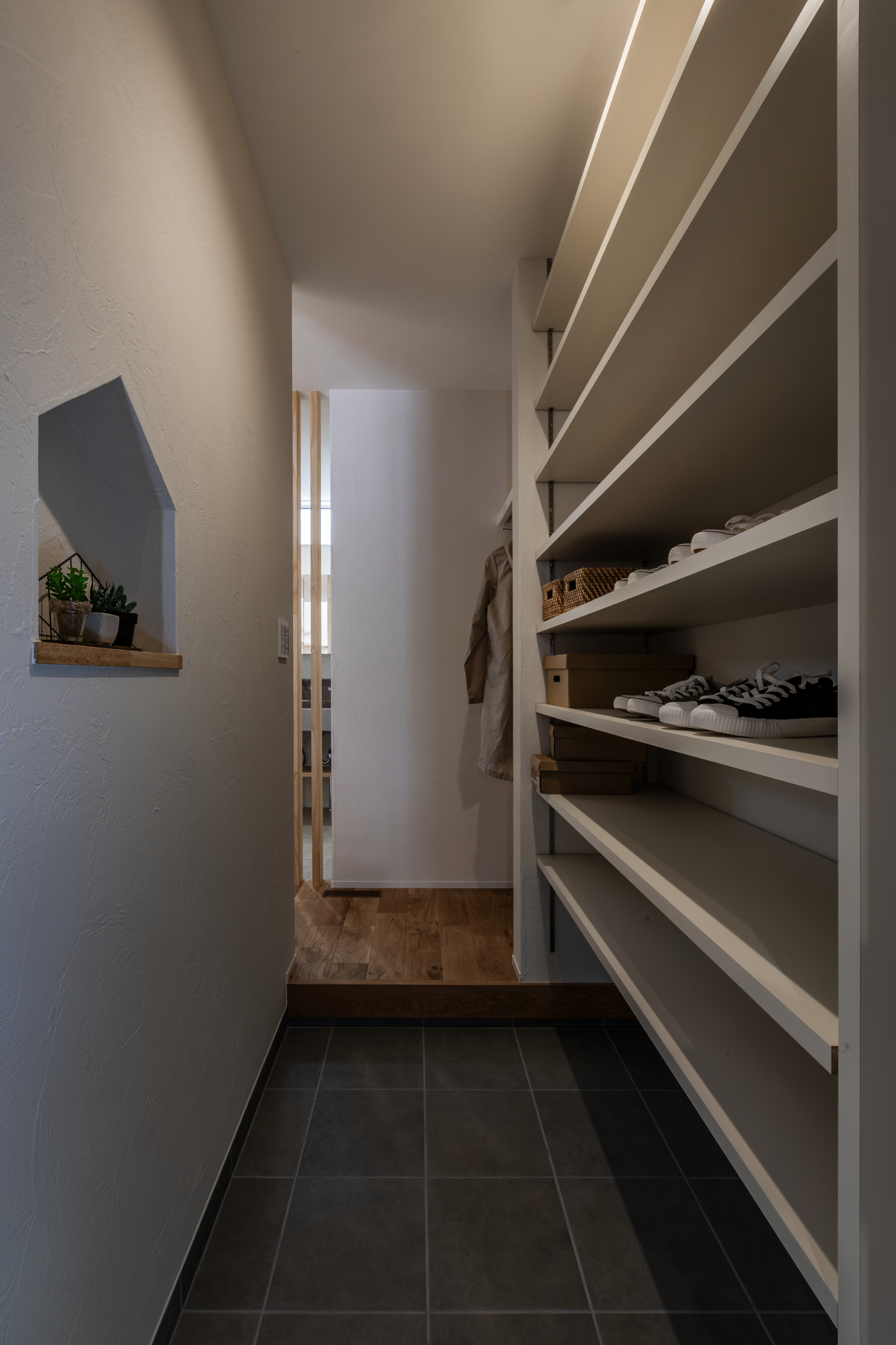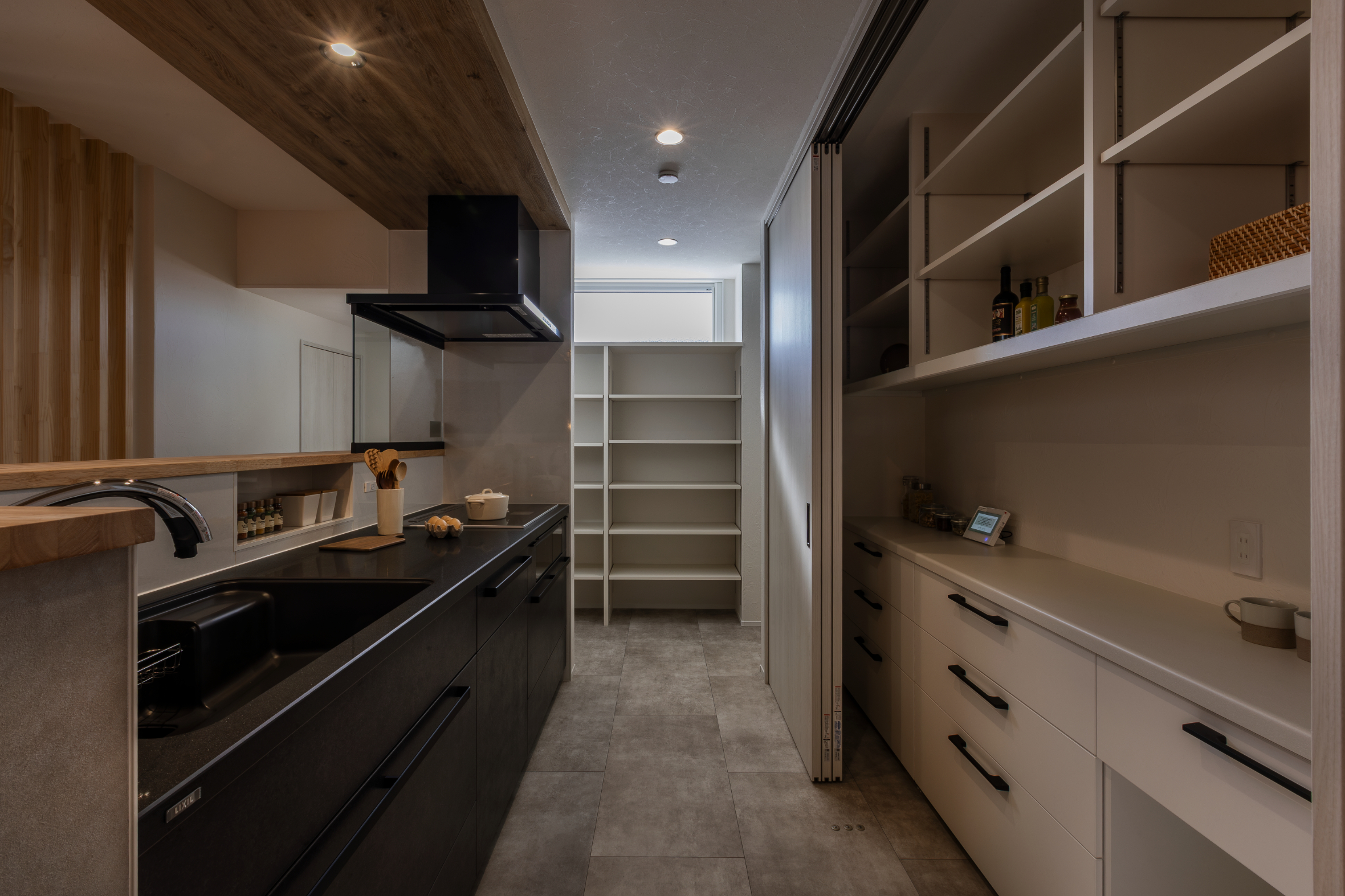 パントリーは収納力をしっかり確保し、キッチン背面収納は扉付きにすることで、