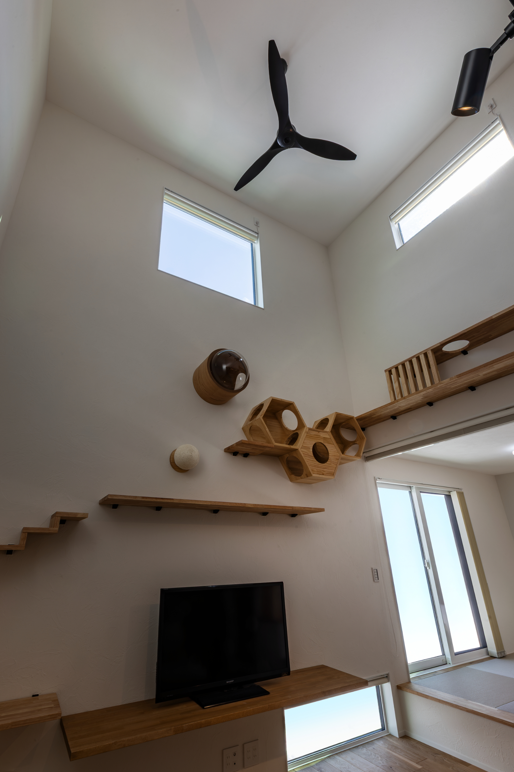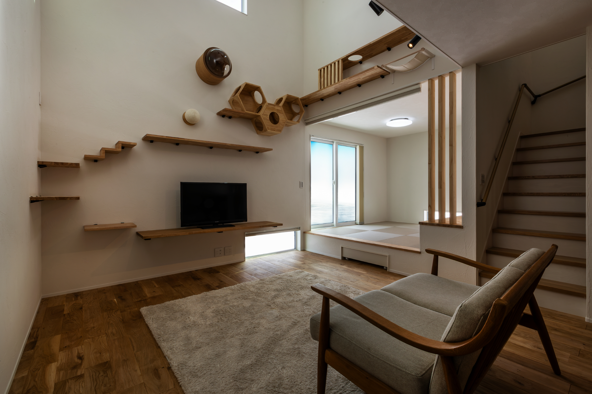 猫ちゃんがのびのびと動き回る様子を、日常の中で楽しめる住まいです。
