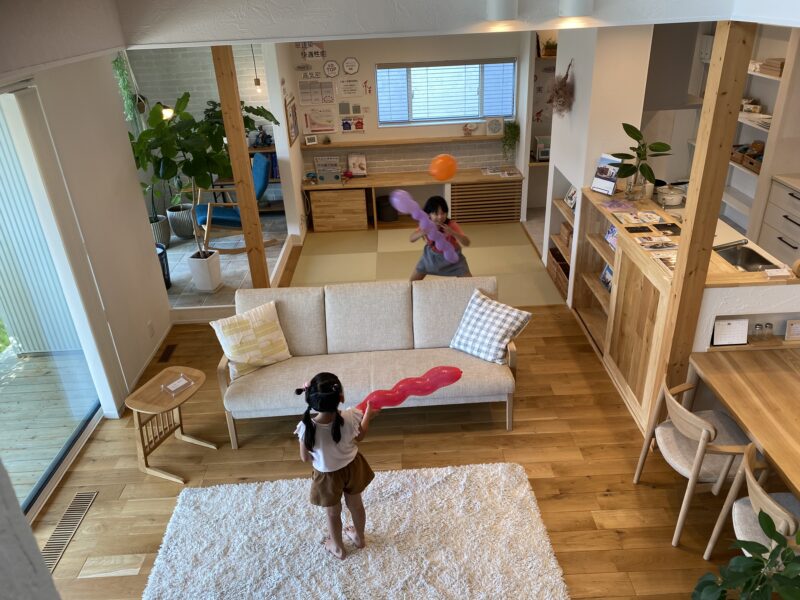 吹き抜けでの風船の奪い合いは恒例行事です。