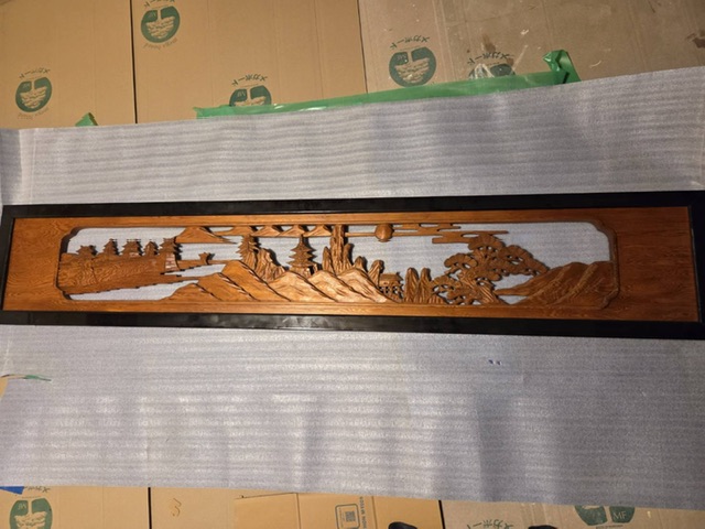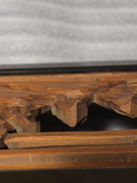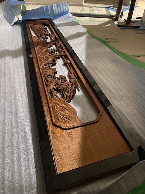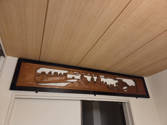 N様邸で以前のお家にあった、木彫りの欄間を壁に貼りました。