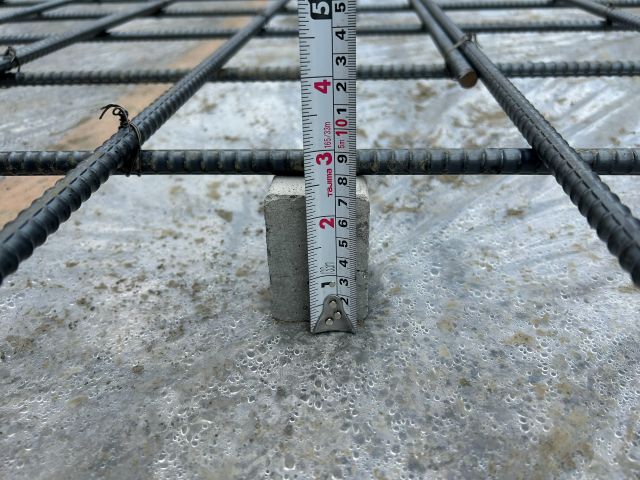 鉄筋のサイズ、鉄筋を組む位置やピッチ、定着の長さ、鉄筋補強の有無、スペーサーの配置、コンクリートのかぶり厚さの確保、防湿シートの破れの有無など。