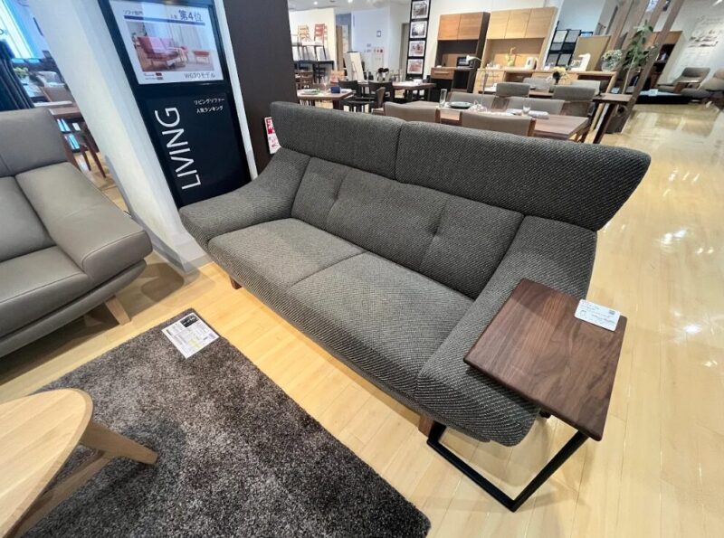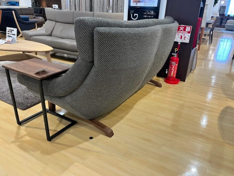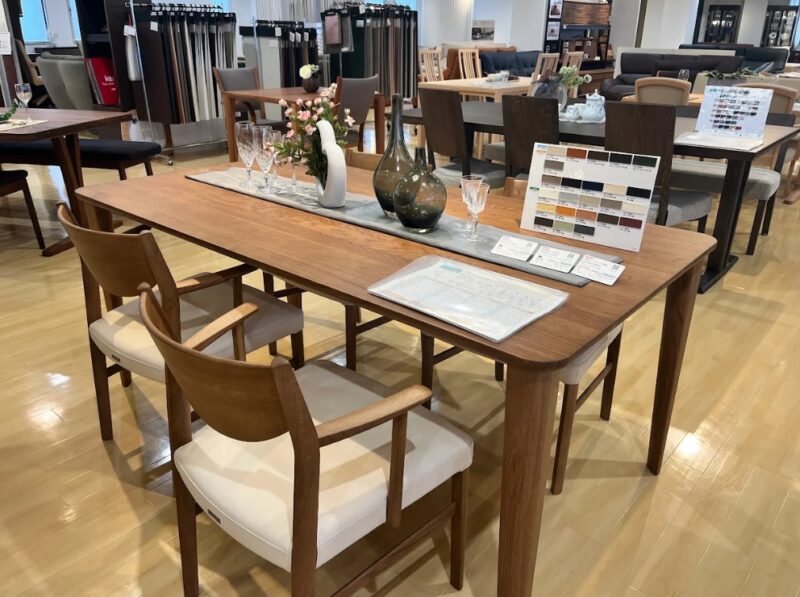 肘かけがありながらもテーブルの下に収納しやすい高さに工夫されていました。