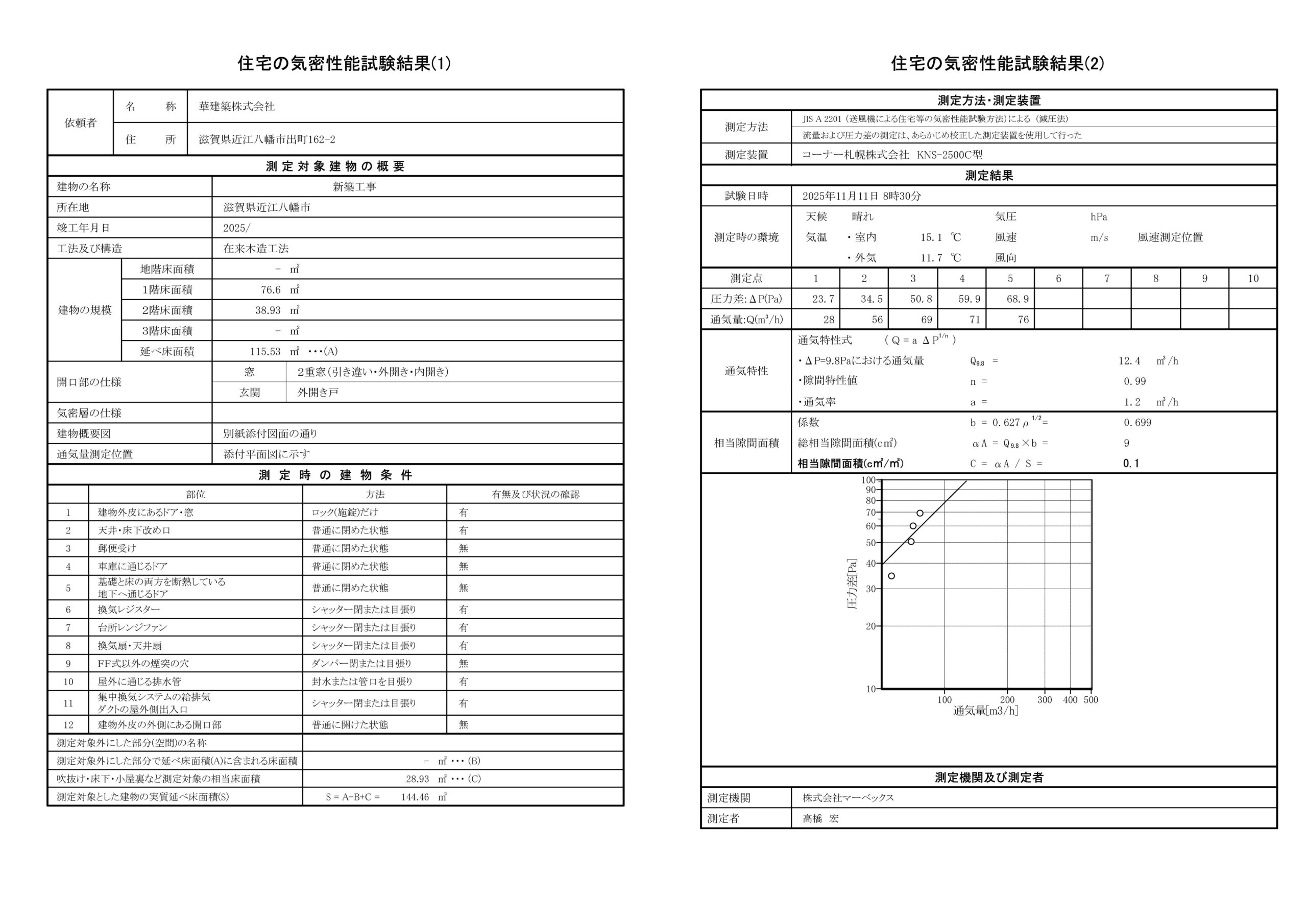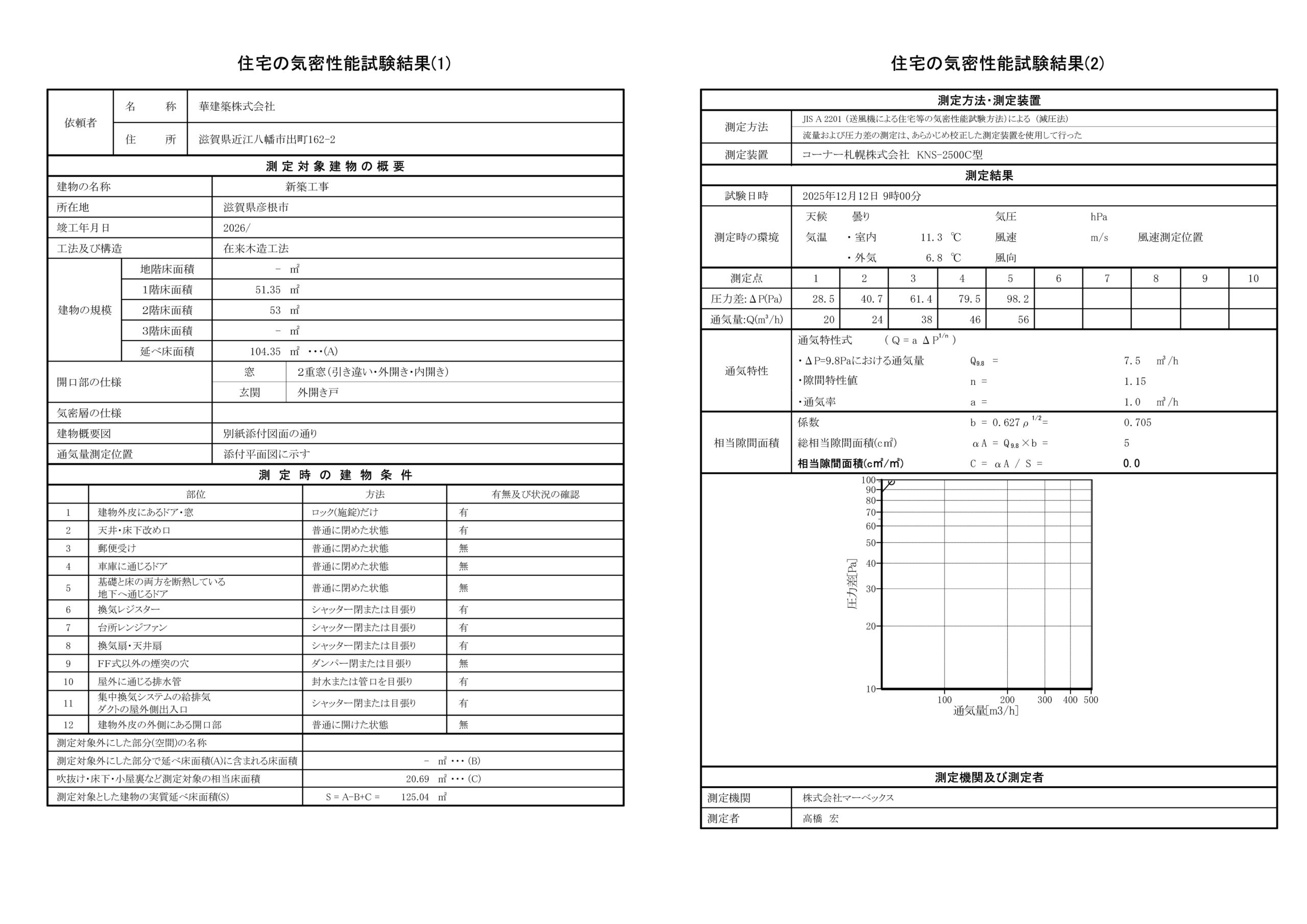 気密測定とは建てた住宅の実際の気密性を試験調査し、その結果を必ず提出しています。また気密性の確認も自社ではなく第三者機関に調査依頼して、華建築で建てた全ての家で気密測定を行っています。